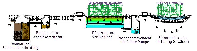 Dennoch habe ich aufgrund meiner langjährigen Erfahrungen etwas Abstand vom Bau von Pflanzenkläranlagen oder Schilfbeeten genommen. Einerseits benötigen diese doch eine gewisse Pflege wie eine regelmäßige Mahd oder die Entfernung von Fremdaufwuchs (Ackerwinde, Brennnessel, Weiden- Erlensprösslinge etc.), zum anderen hat sich gezeigt, dass viele Pflanzenbeete durch Schlammeintrag an Durchlässigkeit verlieren, gerade wenn die Vorklärung klein und damit der Absetzvorgang unzureichend ist, eine Schwimmschlammsperre am Ablauf der Vorklärung fehlt, oder Pumpenschächte nicht ausreichend gereinigt werden. Dies führt dann nach Jahren ggf. zu Rückstau, Pfützenbildung auf der Oberfläche und Verschlammung von Drainageschichten, und damit zu Störungen, die nur mit großem Aufwand wieder zu beseitigen sind. Die Beaufschlagung von Vertikalfiltern kann zudem stets kurzfristig zu Geruchsproblemen führen.